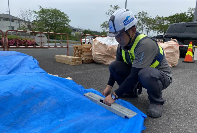 作業が終わったら、工事した場所の仕上がりを測ったり、ちゃんとできているかをチェックします。忘れ物がないか、積み荷が飛び出さないようになっているかなど、安全確認をしてから現場をあとにします。