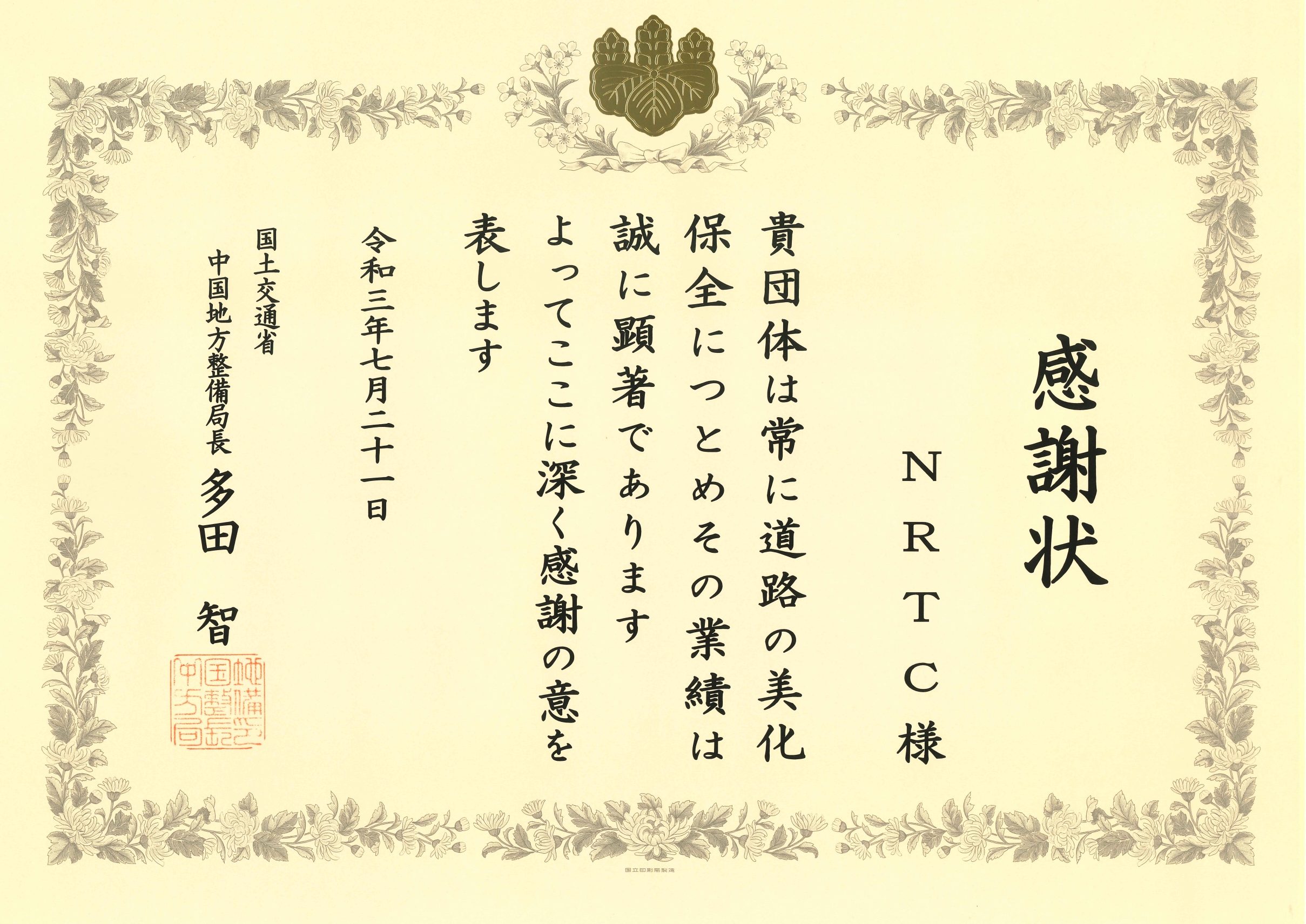2021.11.15 [表彰]国土交通省中国地方整備局 「広島国道ボランティアロード」 感謝状受領 2021年7月21日に国土交通省中国地方整備局 多田智局長より、一般国道2号線 南区比治山本町~中区昭和町(上り区間)の道路美化活動の継続に対しての感謝状を受領しました。