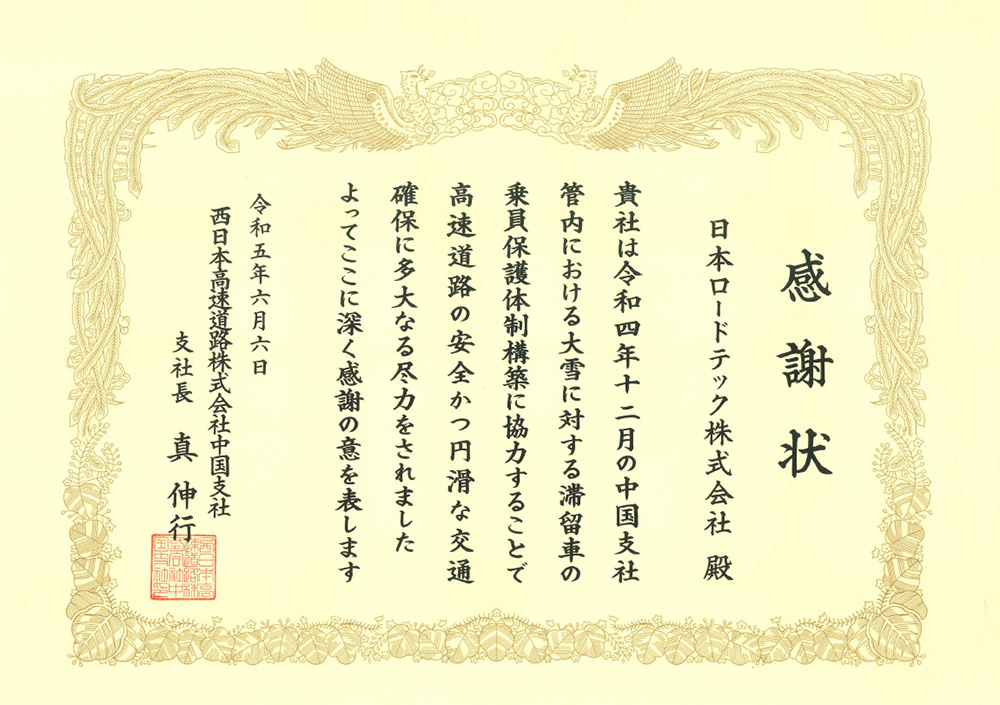 2023.06.19 [表彰] 西日本高速道路株式会社中国支社 大雪災害功労表彰 2023年6月6日に西日本高速道路株式会社中国支社にて、令和4年12月の大雪災害における滞留者乗員保護体制構築の協力に対し表彰を受けました。 [対象工事]令和4年度 中国自動車道 三次高速道路事務所管内 構造物補修工事 [受賞理由]高速道路の安全かつ円滑な交通確保に尽力した。