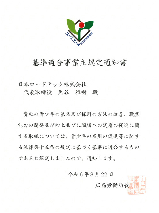 2024.12.05 「ユースエール認定企業」として認定されました 当社は、若手社員の育成と働きやすい職場環境の提供に力を入れており、この度「ユースエール認定企業」として認定されました。今後も引き続きより良い職場環境の提供に努めて参ります。