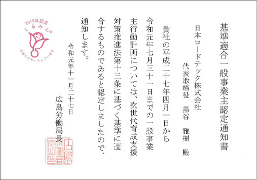 私たち日本ロードテックは、「子育てサポート企業(くるみん認定)」として、子育てと仕事の両立を支える制度の整備と利用促進に取り組んでいます。