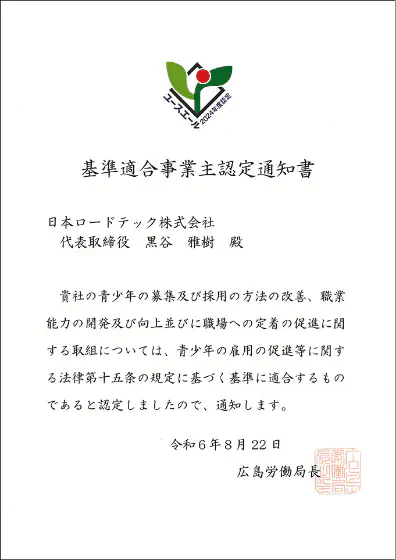 私たち日本ロードテックは、「ユースエール認定企業」として、若手社員の育成と働きやすい職場環境の整備に取り組んでいます。